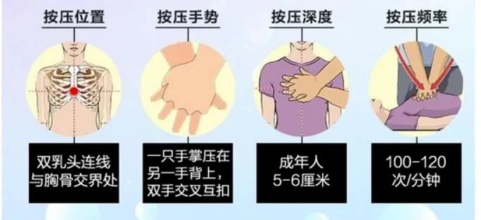 患者体位:平卧位,头偏向一侧,平地或硬板床,翻转时保持患者身体平直、无扭曲,保护颈部。解开病人衣领、领带以及拉链;施救者体位:跪于病人右侧,双膝平病人肩部按压部位:胸骨中下1/3交界处或双乳头连线与前正中线交界处;按压手法:一手掌根部放于按压部位,另一手平行重叠于此手背上,十指交扣指尖翘起,手掌根部接触按压处,手指不接触病人胸壁;双臂位于患者胸骨正上方,双肘关节伸直,使肩、肘、腕在一条直线上,并与患者身体垂直,利用上身重量垂直下压;按压时手掌根不离开患者胸部;按压频率:100-120次/min,不能中断,中断时间小于10秒,按压时间:放松时间=1:1;按压深度:下压深度5-6cm,每次按压之后应让胸廓完全回复。