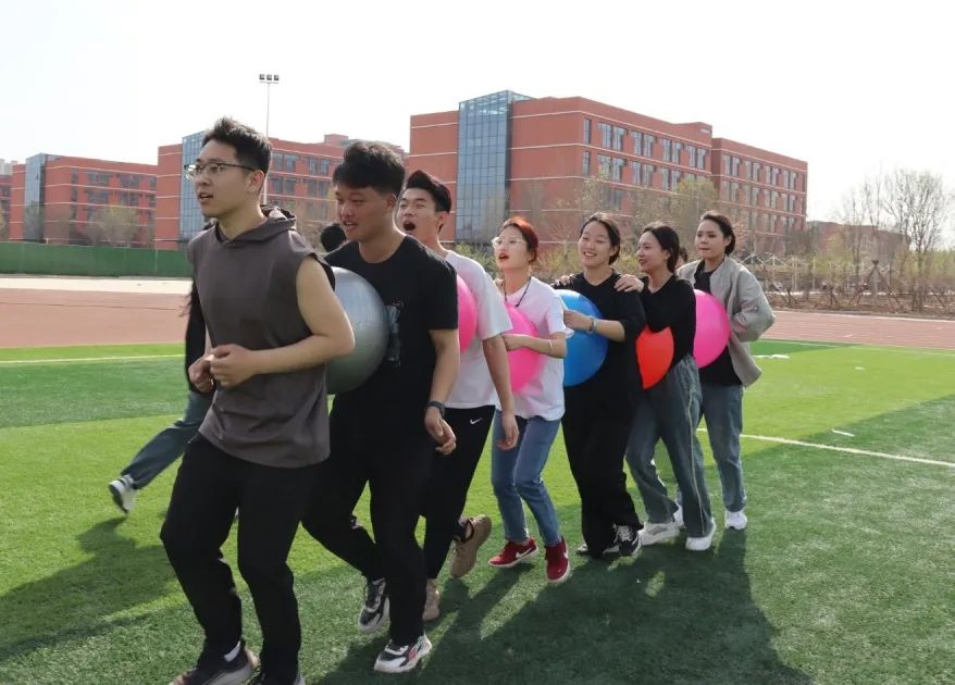 规则:首先十人小队两两组合,两人一小组,背对背将球夹在后背中间,四手相挎不可碰球,绕障碍物跑一圈,交接给下组,直到小队全部完成,记录用时。