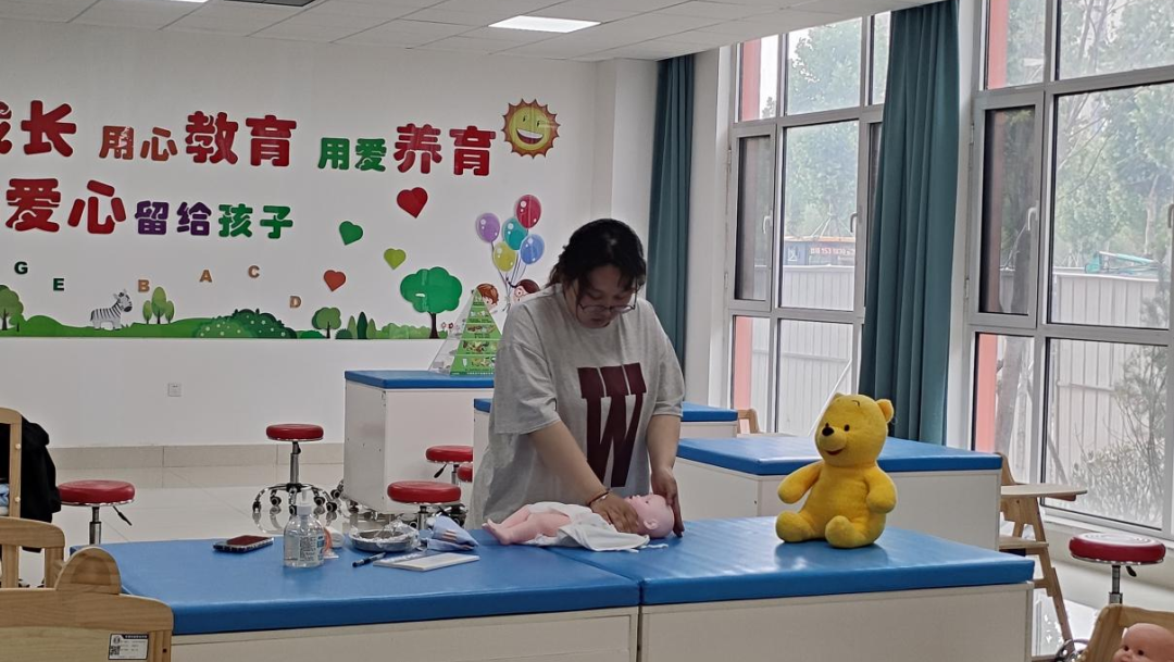 本次大赛分设三部分,第一部分为“婴幼儿照料与护理”,主要考察员工对婴幼儿的回应性照护能力,包括:人工喂养、洗澡、手指操、被动操(4选1);第二部分为“婴幼儿伤害预防及应急处理”,主要考察员工对婴幼儿伤害预防及应急处理的能力,包括:对头皮血肿、1岁以上幼儿气道异物伤害、1岁以下婴儿窒息的应急处理(3选1);第三部分为“游戏活动展示”,主要考察员工的组织与实施等综合能力,根据给定的方案《解救小熊》进行活动展示。