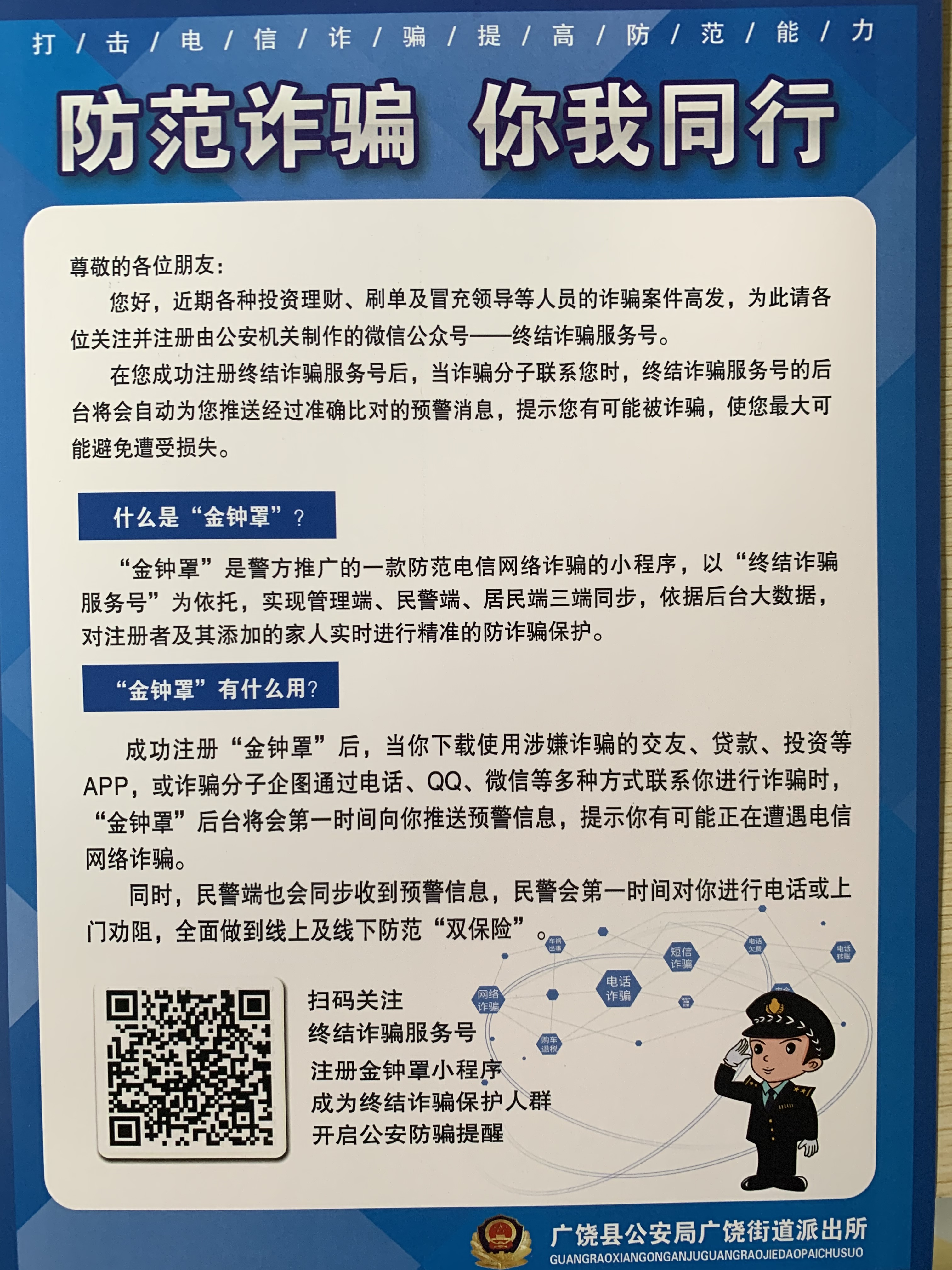 同时针对大员工在面对诈骗时,难以有效作出清晰判断的情况,公安部门专门开设了“终结诈骗服务号”,在班会上辅导员也组织员工进行了关注并注册反诈系统“金钟罩”,以此来增强老员工的防骗意识,提高自我防范能力。