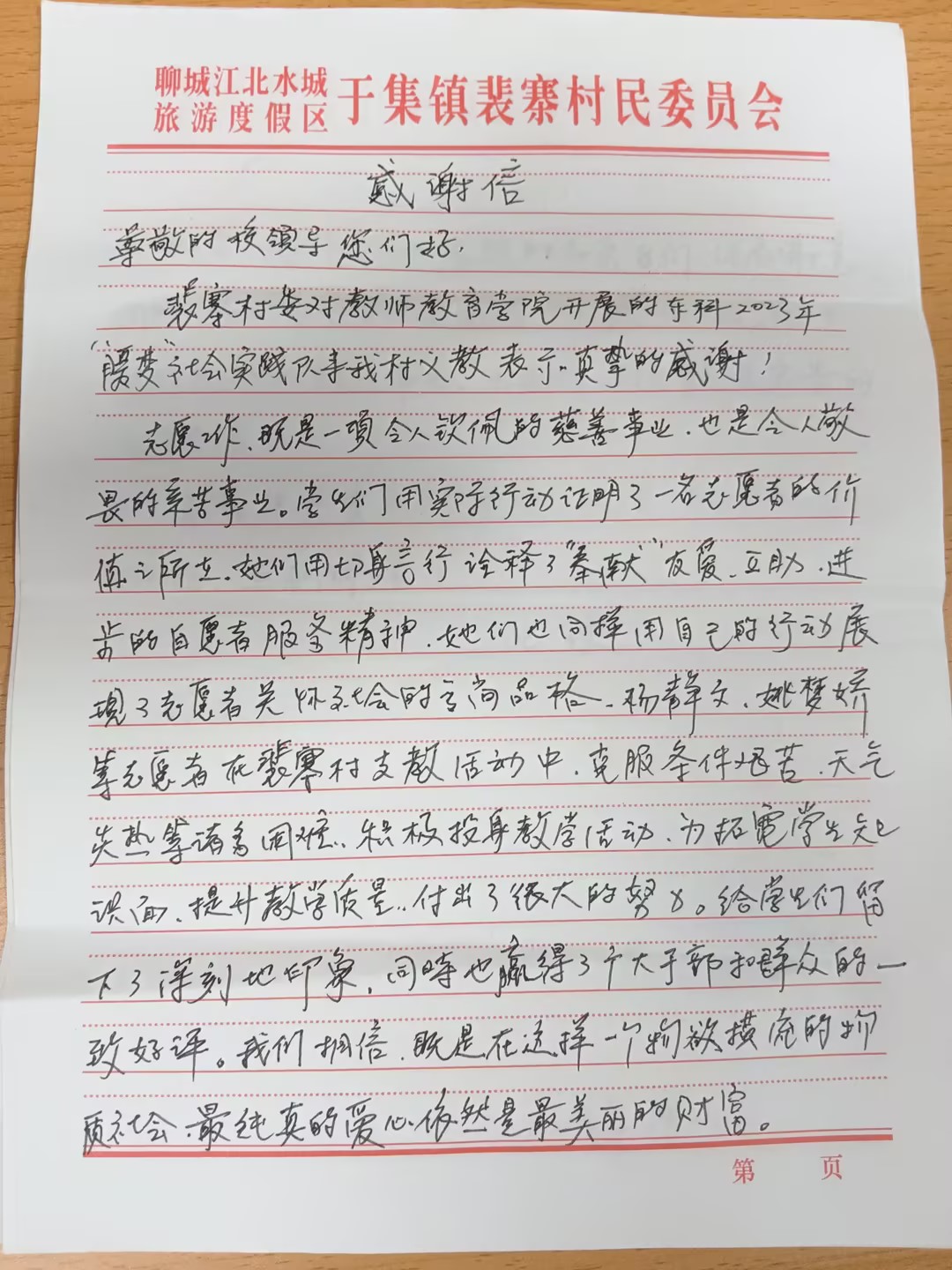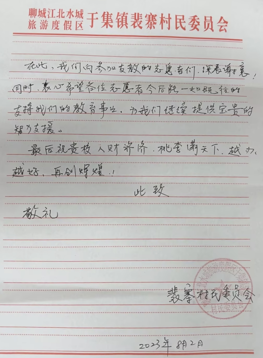 这个暑假,Bevictor伟德官网“三下乡”暑期实践团队——“暖梦”团队,来到山东省聊城市东昌府区于集镇裴寨村开展社会实践活动,他们通过义务支教帮扶乡村儿童,用实际行动诠释着新时代青年的责任与担当。支教期间,“暖梦”团队课程准备认真充分、对待小朋友耐心细致,在小朋友和村委干部心中留下了良好印象。近日,“暖梦”团队收到了来自裴寨村村委的一封感谢信。